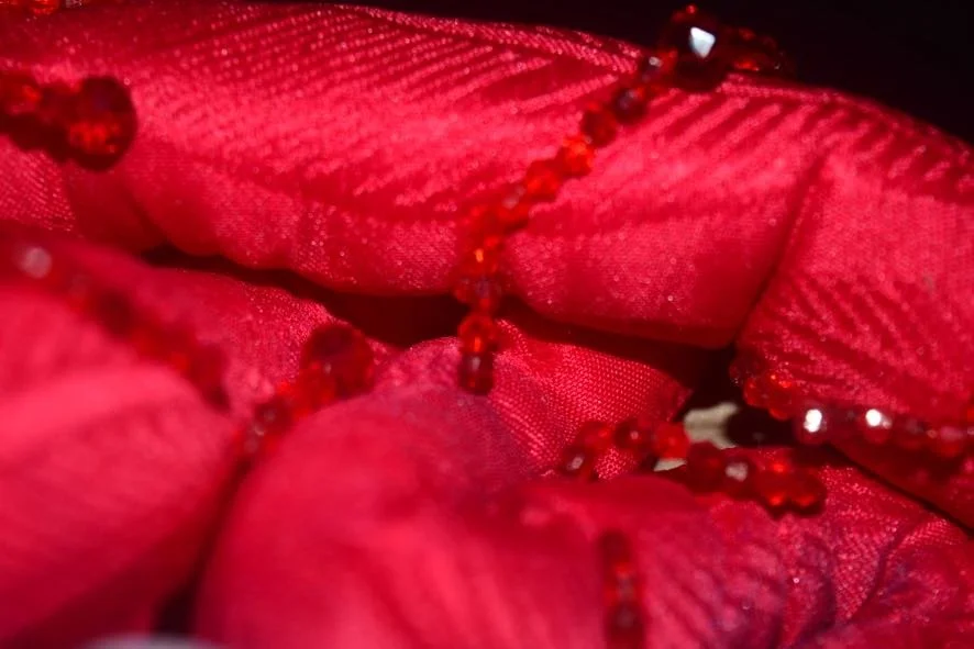 Materiales: tela satinada y tela jacquard, abalorios, porcelana flexible y extensiones de cabello